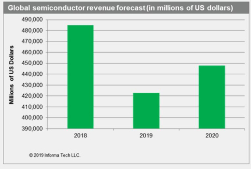 IHS Markit預(yù)計,2020年全球半導(dǎo)體市場收入將出現(xiàn)反彈,從2019年的4228億美元增至4480億美元,增幅會達(dá)到5.9%。這可能會讓英特爾、三星、臺積電、高通、Broadcom等全球頂尖半導(dǎo)體公司松一口氣。